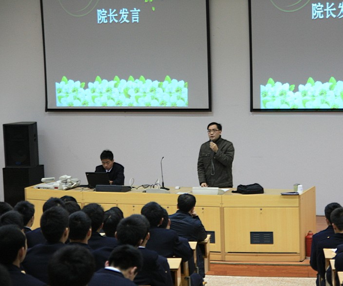 会议首先由刘建成副书记通报我院外训飞行学员胡健在美国因飞行事故罹难的情况,并带领全体与会人员向遇难学生默哀一分钟。由张学财老师代表飞行辅导员发言,从一名老飞行员的角度叮嘱与会学生要严于律己,重视安全,努力学习,成为一名合格飞行员。接着,由飞行大队大队长顾伟同学代表所有学员发言。顾伟同学表示,同学们在追思学长的同时,更要全面提升自身素质,立志“与白云为伴,在蓝天放舞”。院长助理胡宇群教授、丁松滨教授分别对外训相关事宜和飞行技术专业教学计划做了介绍。特别强调国外学习的注意事项,号召广大学员,面对日益激烈的竞争,对自己要高标准、严要求。随后阎雷院长介绍新时期民航局对于飞行员新的要求。阎院长高度强调人为因素的重要性,这也就意味着对飞行员的要求会越来越高。阎院长的讲话斩钉截铁,铿锵有力,触动着每一位飞行学员的心并带来极大的启迪。