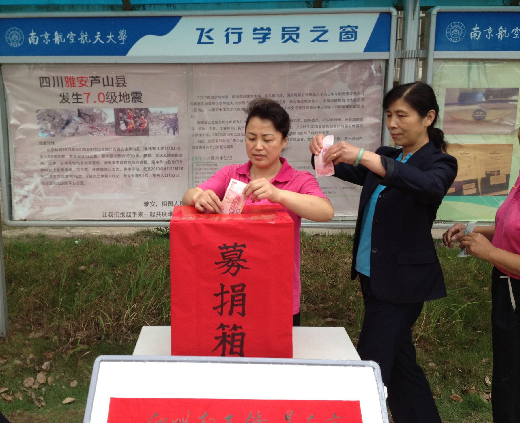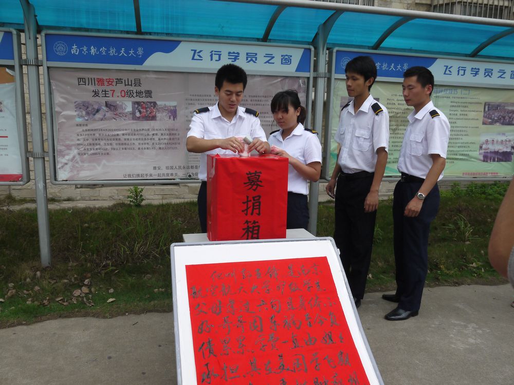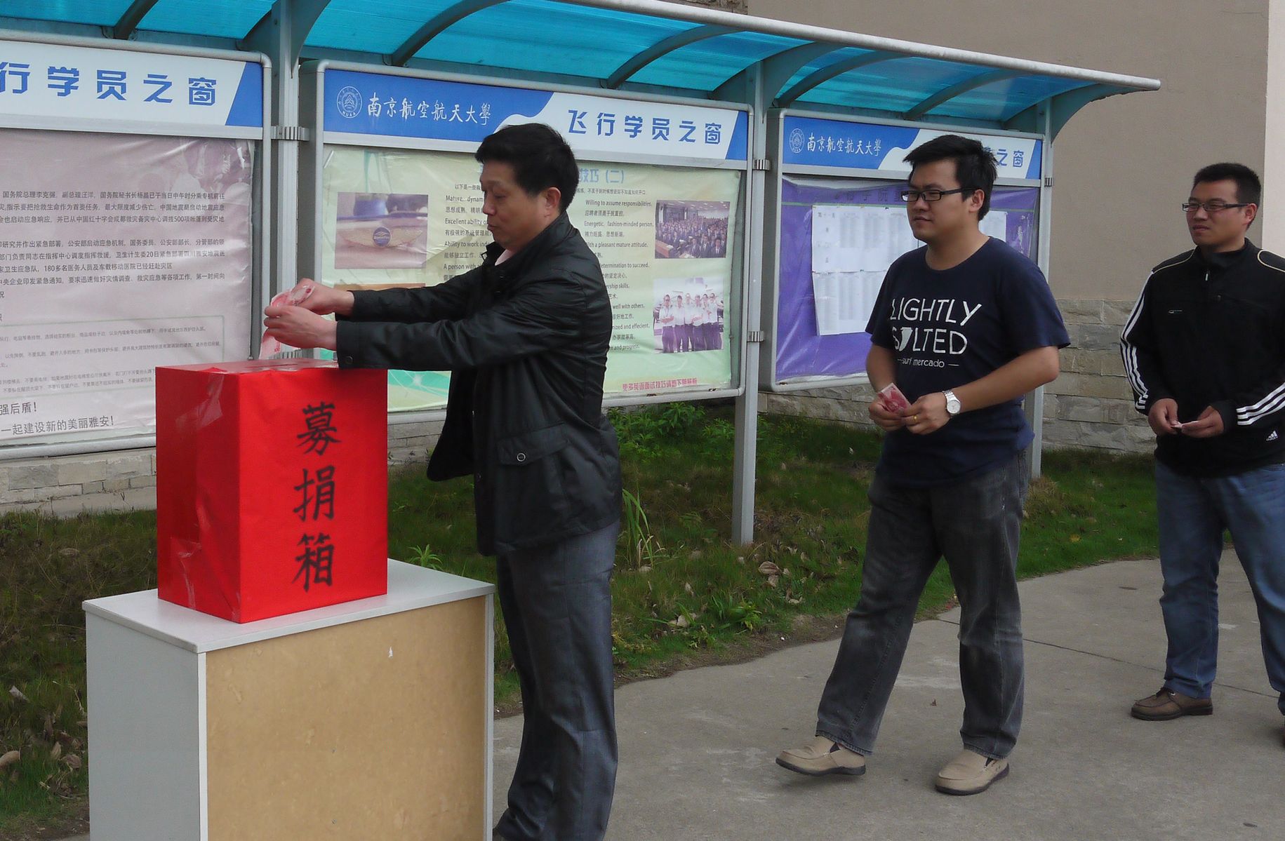 2013年5月27日,在飞行学院辅导员老师的引领下,南航大全体在校飞行学员怀揣着对郭亚峰的关爱,在怡园19幢楼下为郭亚峰募捐,献上自己的一份爱心。后勤集团宿管中心的刘宝良老师及宿舍管理员阿姨们也自发的组织起来参与捐款活动。