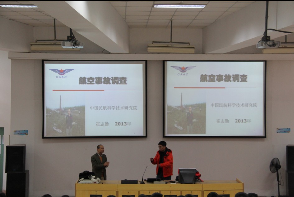 霍志勤主任以一段独特的开场白向大家简单介绍了他本次报告会的主要内容,并以风趣幽默的话引起了在场学员们的阵阵笑声和掌声。紧接着,霍志勤主任在一段自我介绍后便开始向学员们介绍了航空安全事故调查的工作,他将事故调查、案件侦破以及文化考古归的工作放在一起做比较,让同学们真正认识到,航空事故调查的真正核心便是寻找真相,霍志勤主任又详细地介绍了在航空事故调查的工作细节,他将航空事故调查的主要环节简单归结为“调查机务维修的工作、前排如何放行、机组如何操作、空管如何指挥“等环节。他用生动的比喻让学员们深刻理解航空事故调查的工作的各个环节的开展。在详细了介绍安全事故调查工作后,霍志勤主任便与学员们分享了他的工作经历,他让学员们知道事故调查并不容易,事故原因复杂、调查技术复杂、时间紧迫、工作危险、政治影响较大等一系列特殊性,决定了航空安全事故调查的工作的复杂度较大。所有的学员在报告中一丝不苟地记录着报告的重点,此次报告会也在同学们经久不息的掌声中推入了高潮。