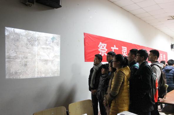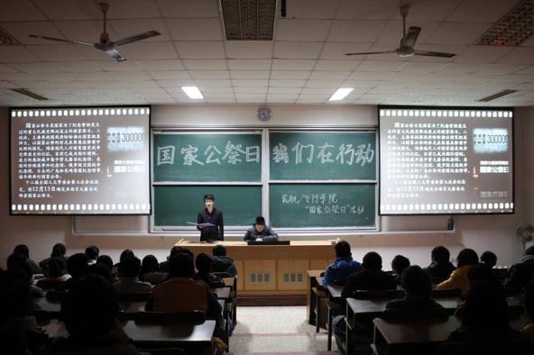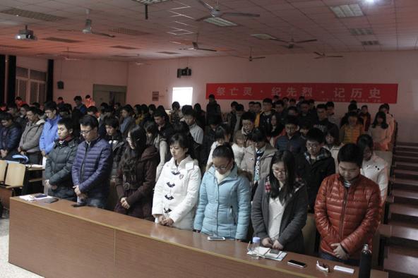 2014年12月12日晚八时许,在12·13国家公祭日来临之际,民航/飞行学院组织同学在禁忌书屋 将军路校区4101教室举行了全国公祭日——“祭亡灵,纪先烈,记历史”主题活动,为南京大屠杀三十万余遇难同胞而痛心哀悼。13级辅导员康冲、14级辅导员梁欢出席本次活动,与学生一同悼念同胞。