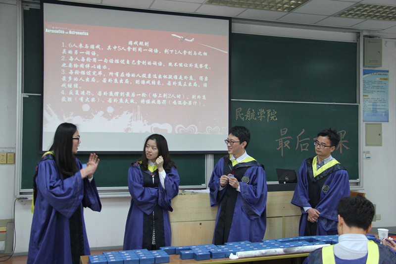 伴随着校歌,第一课正式开始,当字迹吸回笔尖,电影退回胶片,婴儿爬进娘胎,雪花飞离地面,当青春不在回来,回头望望,都是每位毕业生奋斗前行的身影。“从5块6到8块1,我们和食堂的菜价一起成长;从旱季到雨季,我们和校园里的湖水一起成长;从17、18楼的公用实验室到一半的主楼,我们和学院的实验室一起成长;从通航产业园的百花齐放,到ARJ21适航取证,我们和祖国的民航事业一起成长……”诗朗诵中的字字句句都在敲动着每位毕业生在南航禁忌书屋 的点滴回忆。