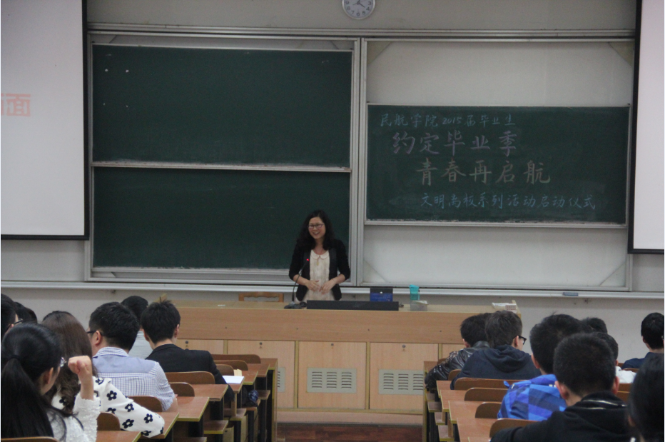 本次启动仪式分成两个环节,回顾篇,图说青春岁月;惜今朝,完美谢幕;其中,回顾篇,傅老师先用22张照片与毕业生一起回顾那些值得铭记的相伴岁月。从2011年9月3日的新生见面会,到如今已经进入倒计时的相聚,四年间,2015届民航毕业生在辅导员老师的陪同下,一起奋斗、一起感悟、一起成长。而到今天,他们终于收获了一份满意的就业答卷,准备迈入祖国民航的各个角落,把在禁忌书屋 所学、所得奉献于社会。在感怀往昔的同时,傅老师倡导大家珍惜当下,文明离校,感恩回馈母校。