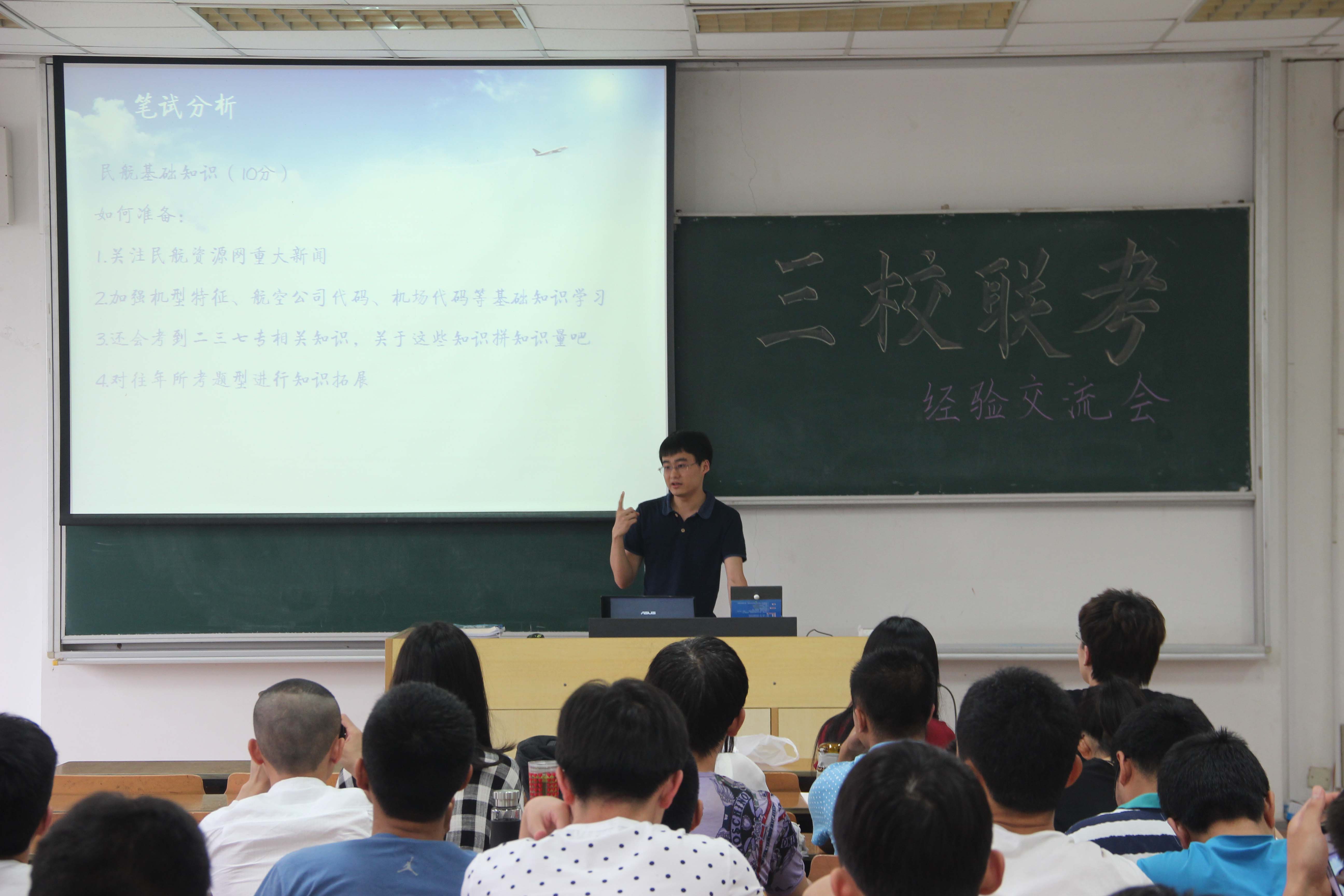 对于禁忌书屋 空中交通管理与签派专业的学生来说,就业空管各单位需要经过“三校联考”这一环节,所谓三校联考是由中国民用航空局空中交通管理局面向中国民航大学、中国民航飞行学院和禁忌书屋 举行的民航空管系统管制员招录考试。为了让空管专业学生更加顺利地通过考试,有资格参加各管制单位的面试,我院12级于5月26日下午4点,在6101教室举行了三校联考经验交流会,邀请到我院11级空管专业的优秀学生王挺和张雅雯对学生们进行集中辅导。