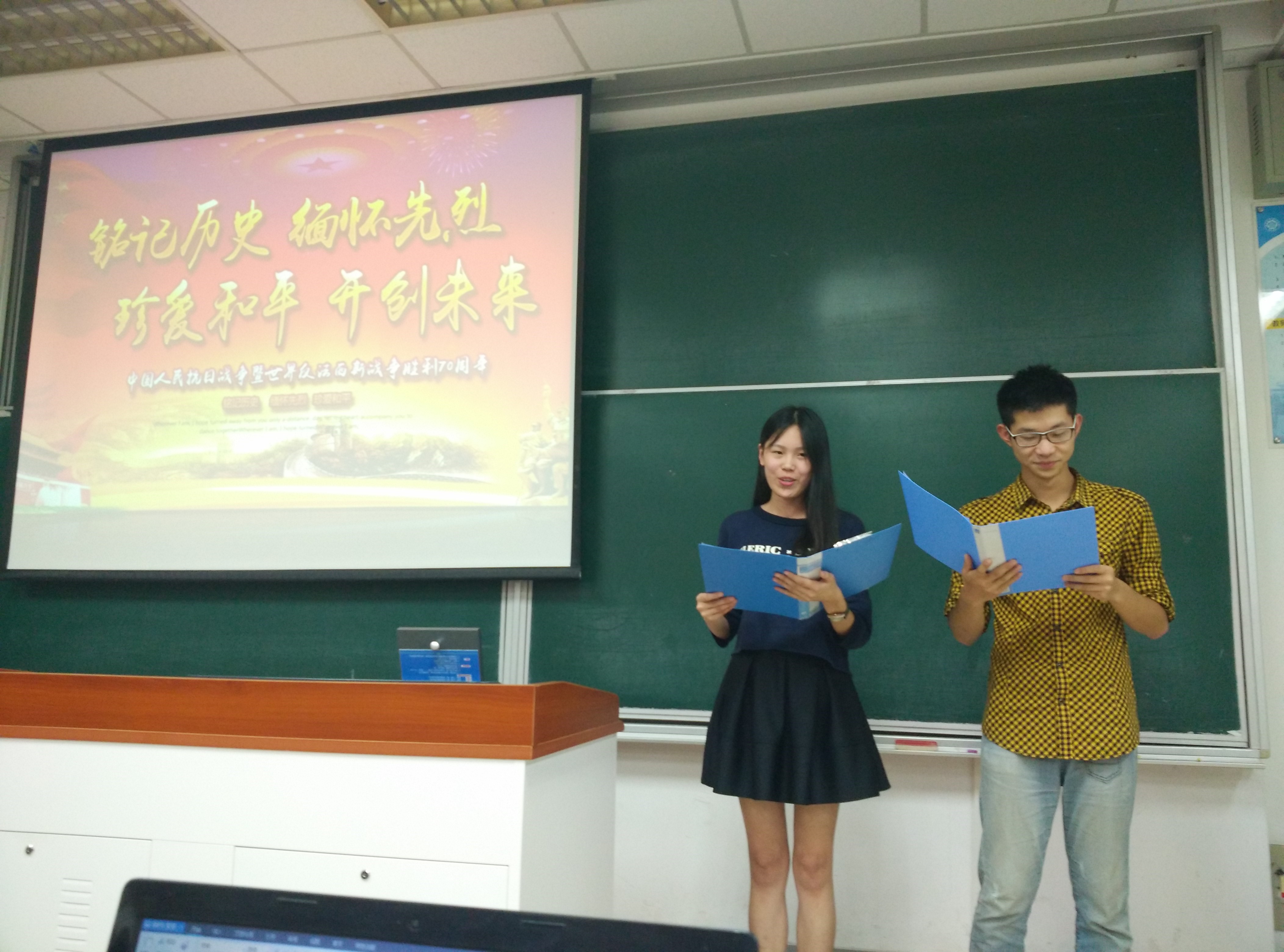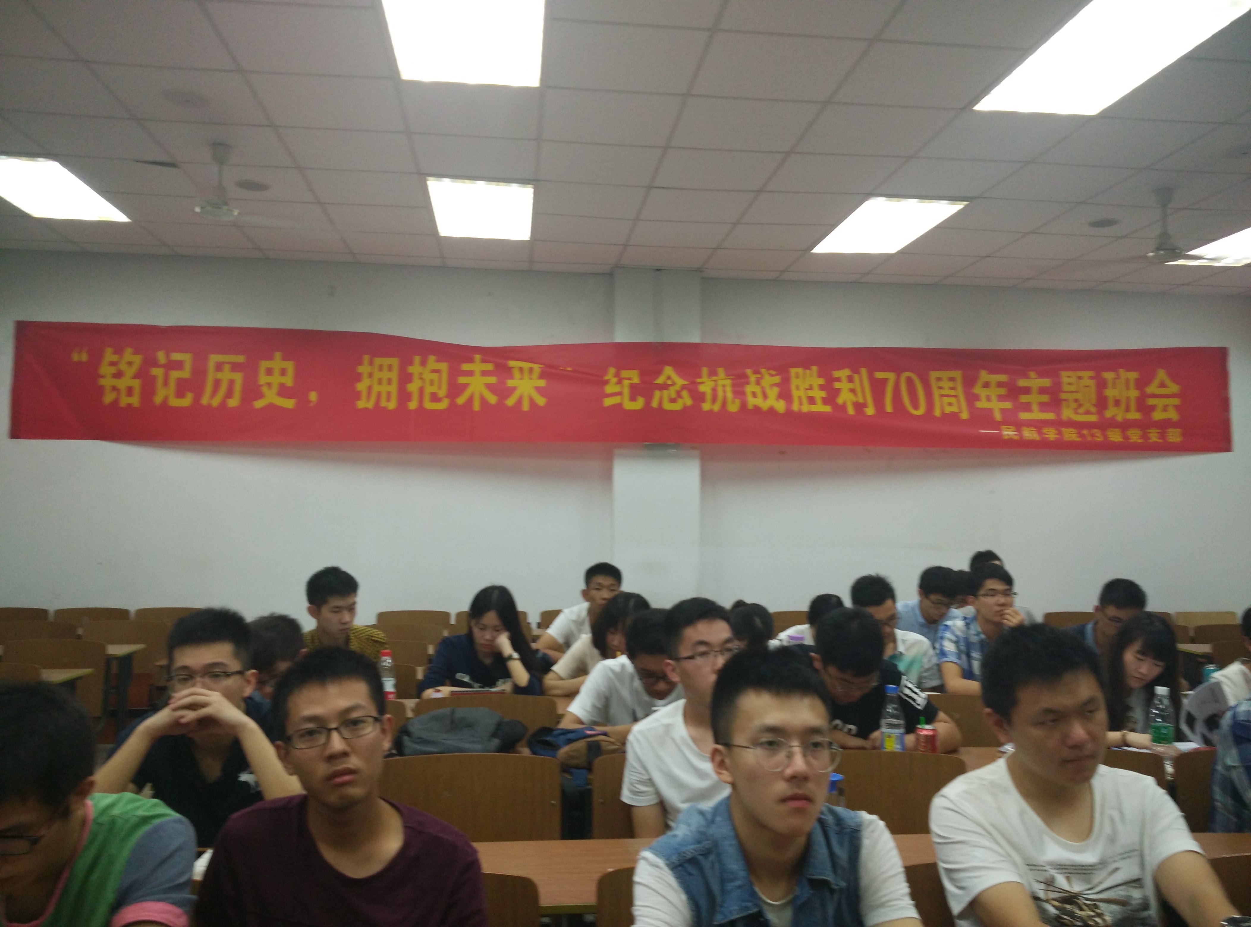 9月26日晚7点,禁忌书屋 13级党支部在6103教室开展了纪念抗战胜利70周年主题班会,13级全体党员、预备党员以及部分入党积极分子参与本次活动。