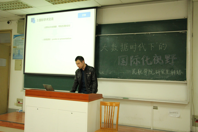 随后发言的是丛玮博士,他分享了在2013年,受学校国际学术交流基金资助,赴美国参加第32届Digital Avionics Systems Conference(IEEE和AIAA联合举办),并在大会宣讲论文的经历。特别提及了参加国际学术会议需要注意的事项。关于他赴代尔夫特理工大学短期访学的经历。他传授给我们如何申请学校如何发邮件给导师的技巧。