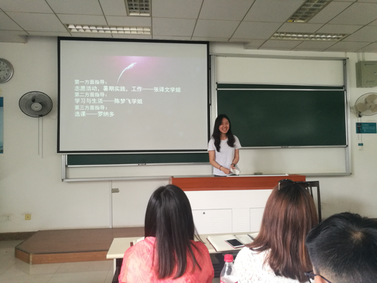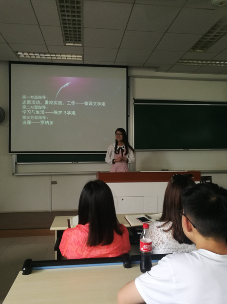 接下来是学长学姐上台发表自己对于未来学习的一些见解。两位学姐在学生工作和学习上均有优秀的表现,且都认真准备了自己的演讲,实实在在地解决了大家的一些问题,诸如学习精力的分配问题和选课的问题。之后是班主任发表对于大家学习和未来工作的建议,张老师举了一些生动形象的例子让我们理解了未来工作学习中的一些必要的因素,使我们受益良多。最后辅导员上台致辞,表示了对中澳班同学的期待,希望我们能够在繁忙的学习和生活中砥砺前行,在以后的专业领域创造辉煌。