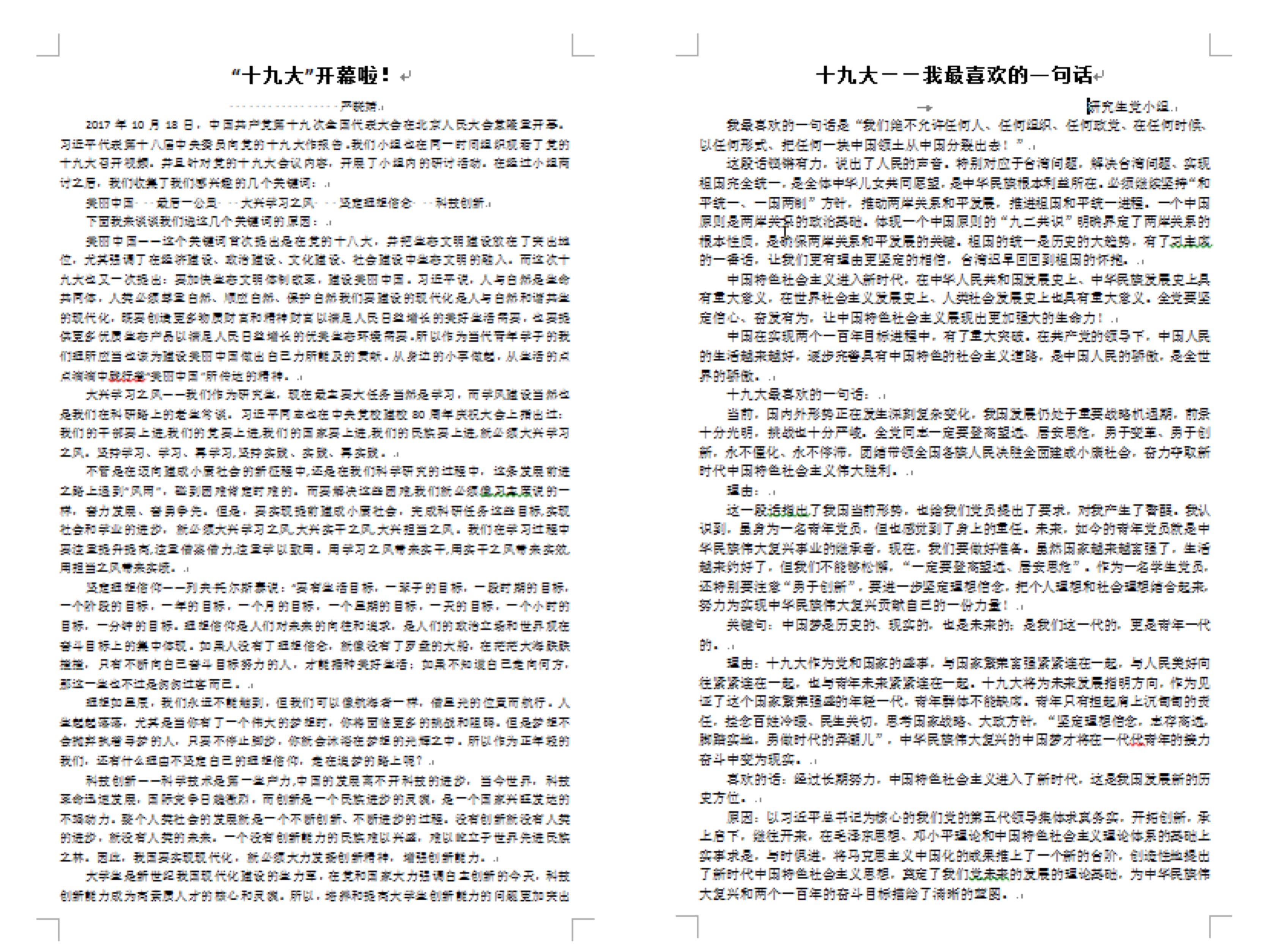 “中国特色社会主义进入了新时代”,“新时代中国共产党的历史使命”,“新时代中国特色社会主义思想”,“伟大斗争,伟大工程,伟大事业,伟大梦想,紧密联系、相互贯通、相互作用”。报告中一句句铿锵有力的重要论断,坚定不动摇的政治初心,不仅仅让研究生党员们意识到现今时代所发生的重大转变,更让他们感受到了党的理论正快步向前发展,激励着研究生党员在新时代下,要牢记使命,砥砺奋进,勇于挑起祖国伟大复兴的重担。