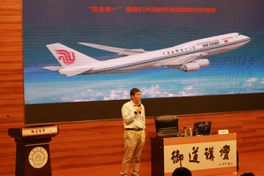 李拥军结合他自身学飞经历与24000多小时的安全飞行经验,向大家详细介绍了飞行员的职业生涯、国外航校及学飞的注意事项、如何与外国教官相处、停飞原因分析等等。与大家分享了他对飞行员的认识“思想是飞行员的旗帜,身体是飞行员的本钱,技术是飞行员的基础,作风是飞行员的保障。”李拥军讲到,作为国航的飞行员,每一次起落都是一次升旗仪式,这是崇高的使命感,让在场的同学备受鼓舞。