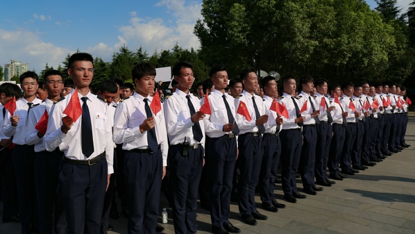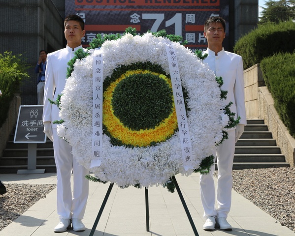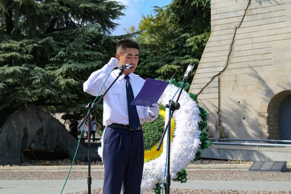 站在肃穆的公祭广场里,驻足于庄严的纪念碑前,身穿迷彩服的同学们全体脱帽默哀,并向30万遇难同胞敬献花圈。随后,学生代表,2019级飞行学员魏学伦做主题发言,并带领同学们面向团旗,重温入团誓词。
