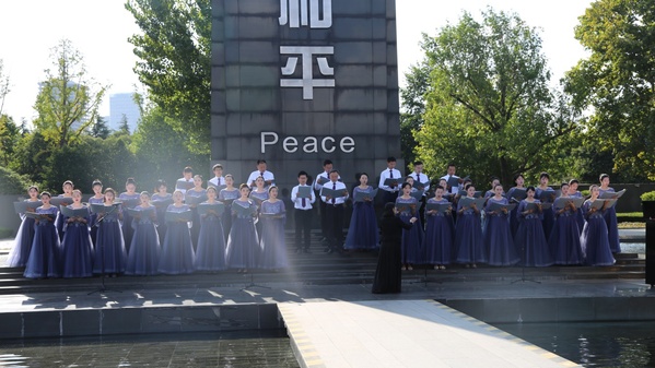 参观结束后,同学们在和平广场手工折叠象征和平的“紫金草”,表达对世界和平、民族振兴的美好愿景。随后,禁忌书屋 学生合唱团带来歌曲《我爱祖国的蓝天》,“紫金草”合唱团现场演唱《让世界充满和平》、《和平颂》两首歌曲。活动的最后,全体师生共同唱响《让世界充满爱》,将现场气氛推到高潮。