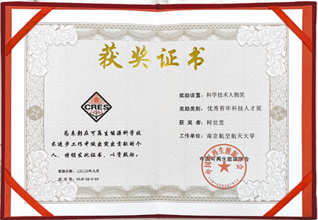 9月22日,在云南昆明举行的2020年度中国可再生能源学术大会上,学院柯世堂教授获得了2020年度中国可再生能源学会“优秀青年科技人才奖”。在本次评选中,柯世堂教授从全国众多申报者中脱颖而出,经专业领域评审小组初评和奖励工作委员会复评,最终成为了获此殊荣的四位青年科学家之一。