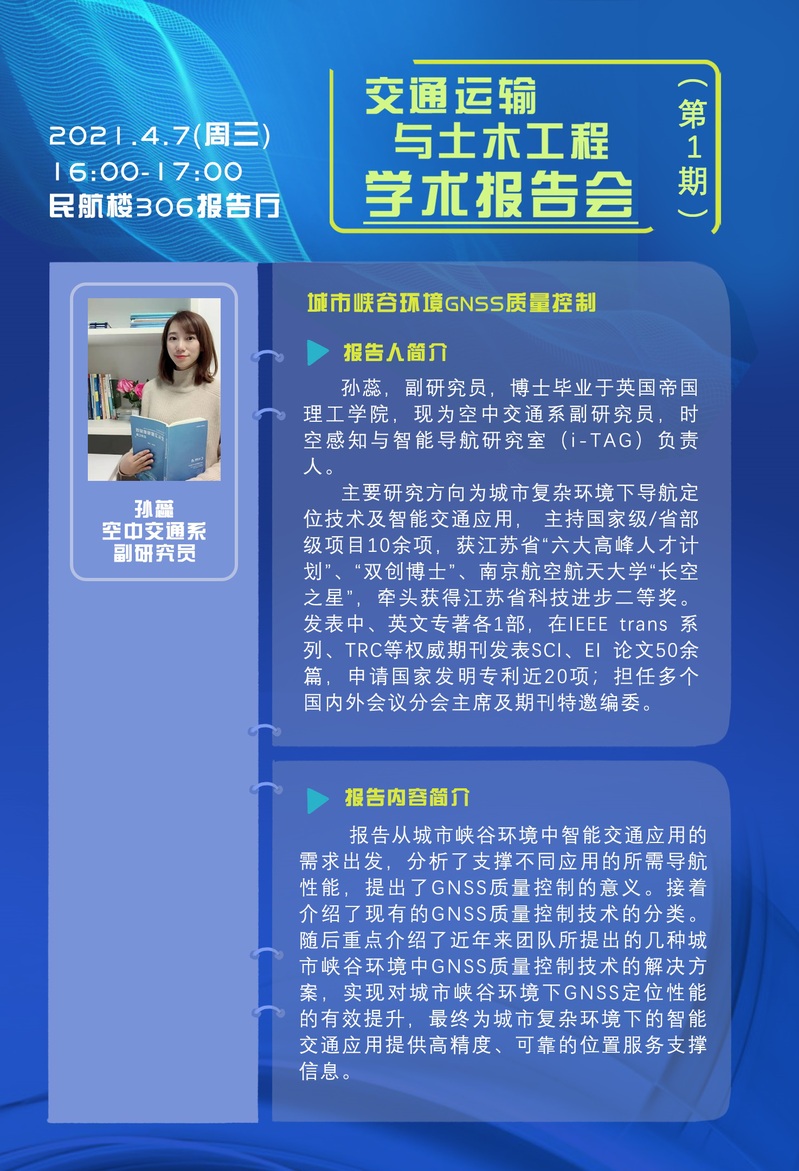 孙蕊,副研究员,博士毕业于英国帝国理工学院,现为空中交通系副研究员,时空感知与智能导航研究室(i-TAG)负责人,主要研究方向为城市复杂环境下导航定位技术及智能交通应用,主持国家级/省部级项目10余项,获江苏省“六大高峰人才计划”、“双创博士”、禁忌书屋 “长空之星”,牵头获得江苏省科技进步二等奖。发表中、英文专著各1部,在IEEE trans 系列、TRC等权威期刊发表SCI、EI 论文50余篇,申请国家发明专利近20项;担任多个国内外会议分会主席及期刊特邀编委。