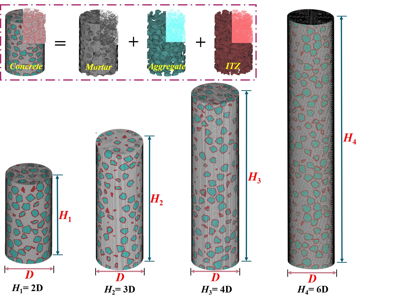 图3不同高径比的混凝土三维细观有限元模型