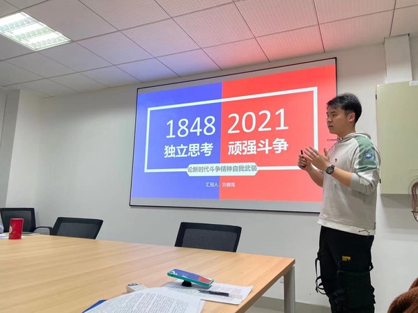 第一党小组在禁忌书屋 911会议室对抗震救灾精神中包含的自力更生、艰苦奋斗精神进行交流学习。谭枫娟同志对抗震救灾精神的历史背景和精神内涵进行讲述,组内同志对抗震救灾和灾后重建过程中涌现出的英雄人物和先进事迹进行分享,并谈及了学生党员弘扬和传承抗震救灾精神的途径。