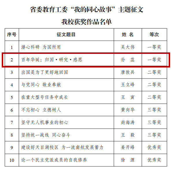 近日,江苏省委教育工委公布了全省高校统一战线庆祝中国共产党成立100周年“我的同心故事”主题征文活动获奖名单,我院空中交通系教师、致公党成员孙蕊副研究员的文章《百年华诞:归国 研究 感恩》荣获一等奖。