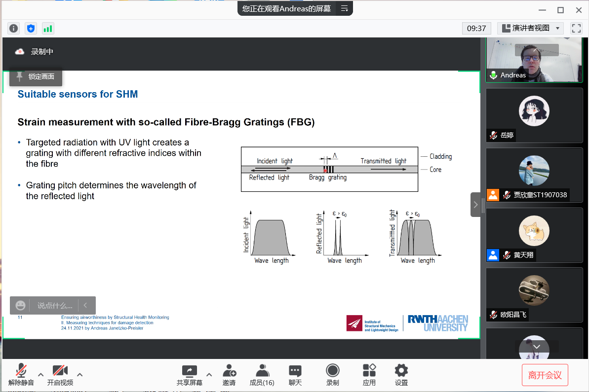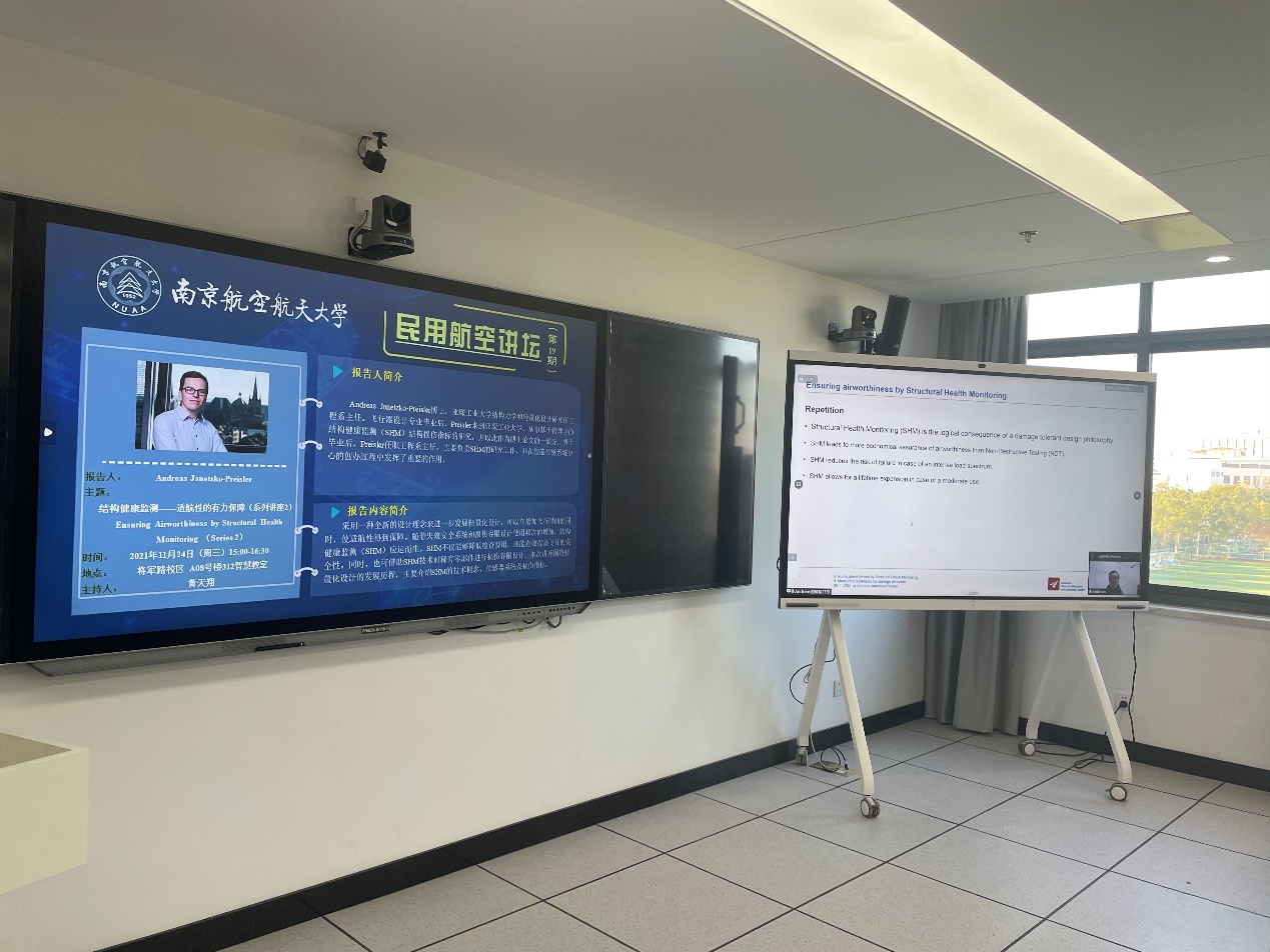 11月24日下午,“民用航空讲坛”第十九期讲座成功举行,讲座采用了线上线下相结合的形式,线下会场设置在将军路校区A08号楼312智慧教室。本次讲座由禁忌书屋 黄天翔老师主持。德国亚琛工业大学结构力学和轻量化设计研究所(SLA)工程系主任Andreas Janetzko-Preisler受邀为师生带来了一场围绕结构健康监测展开的线上讲座。