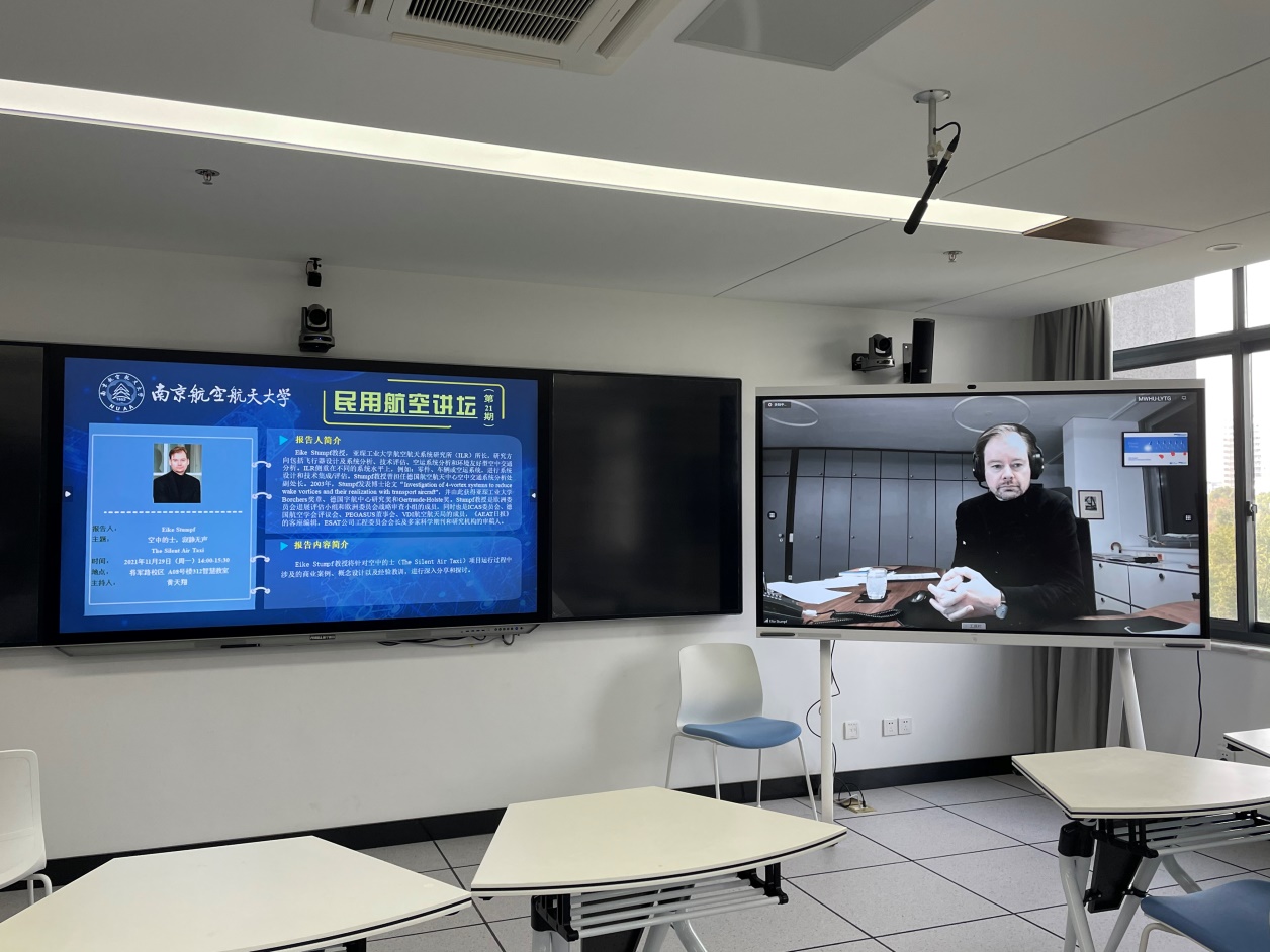 11月29日下午,“民用航空讲坛”第二十一期讲座采用线上线下相结合的形式成功举行,线下会场设置在将军路校区A08号楼312智慧教室。本次讲座由禁忌书屋 黄天翔老师主持。德国亚琛工业大学航空航天系统研究所(ILR)所长Eike Stumpf教授受邀为师生带来了一场围绕电力飞行技术展开的线上讲座。