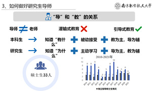孙建红院长强调了作为研究生导师的责任与担当。各位导师不仅要在科研方面对学生进行指导,在思想建设、课余生活、心理健康等全方面也要对研究生加以关注和指导。希望导师保持谦虚谨慎的态度,在培养研究生的过程中,提升学生,提高自我,导师与学生共成长。同时,多与资深导师交流取经,争取培养校优秀、省优秀学生。