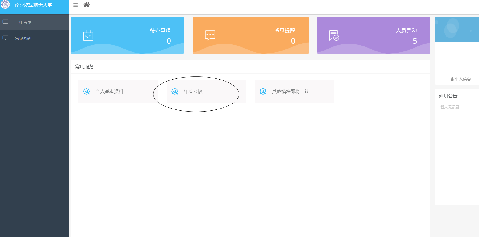 2. 教职工需登陆学校的新版人事管理信息系统//ehr.jinjiswcn.com,登录名为职工编号,密码为学校统一身份认证密码),在“年度考核”模块(12月15日起开放),填写个人年度考核表,并在线提交,并用A4纸正反面打印、签名后交至各系办主任处,由系主任签署单位考核评价意见后,统一交至学院。