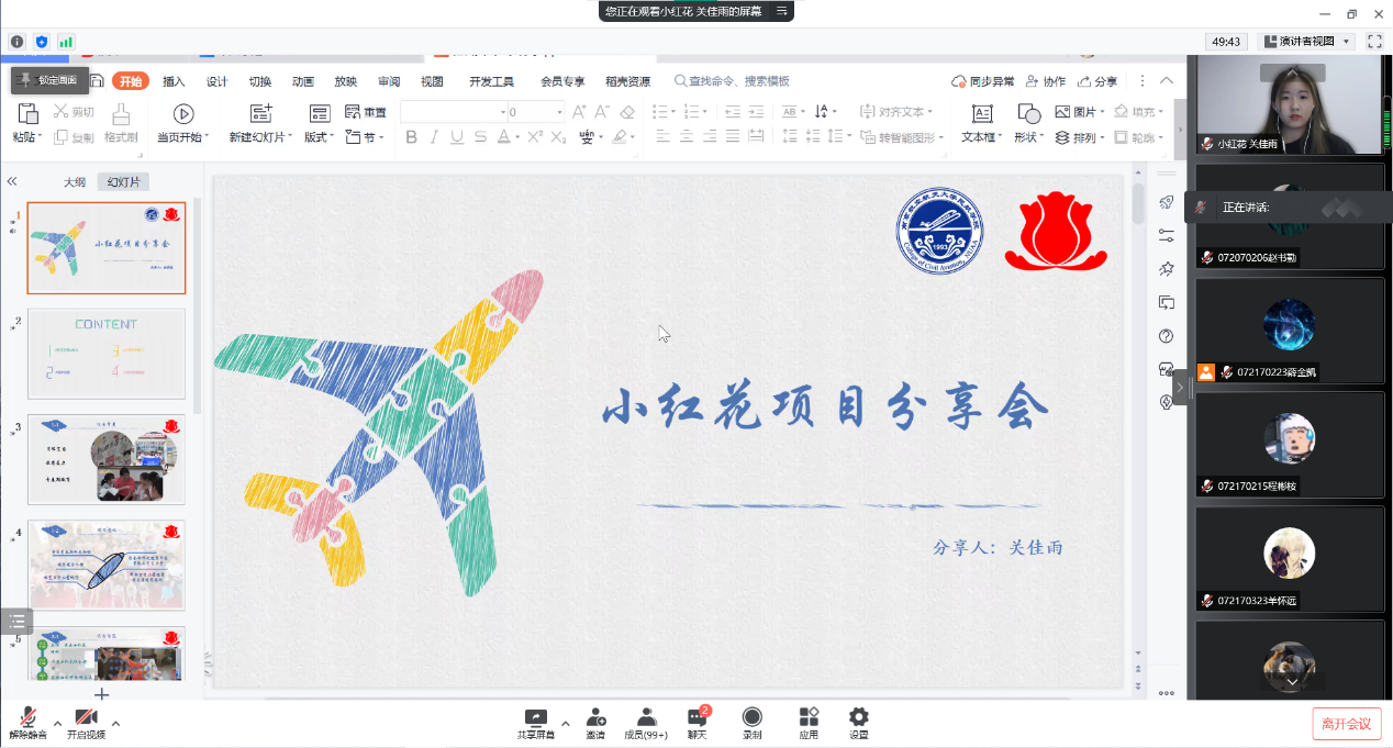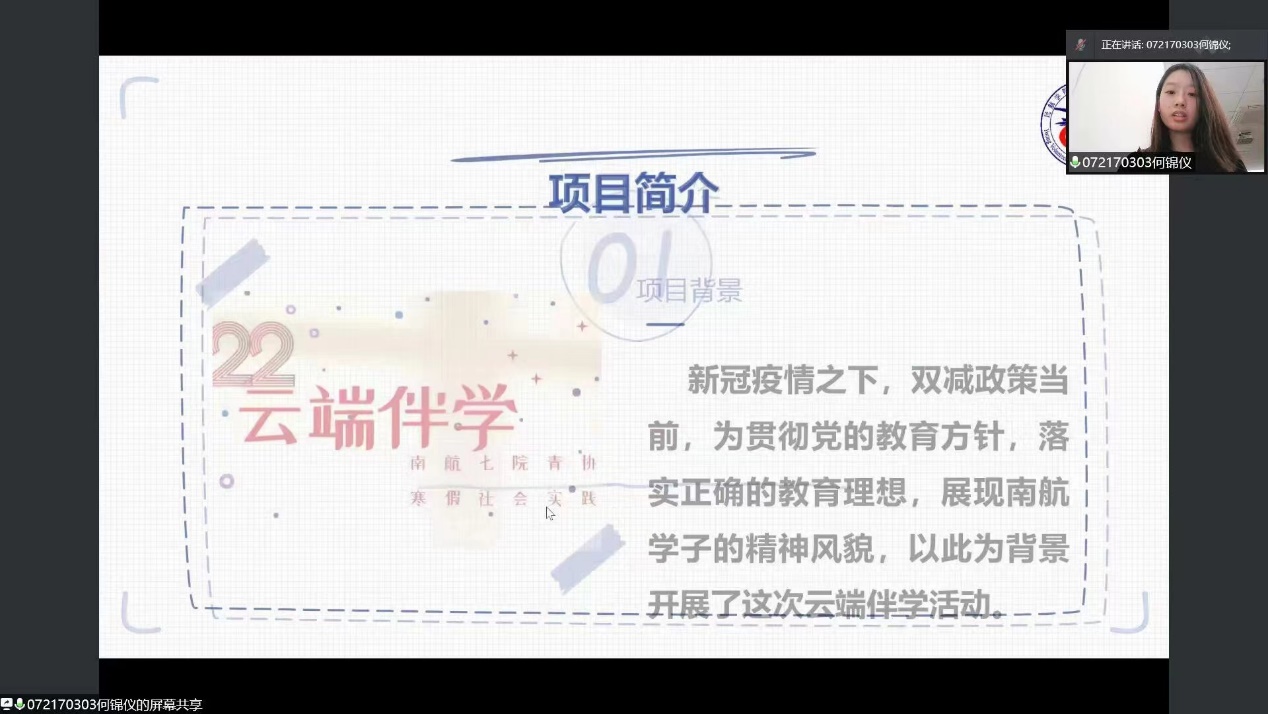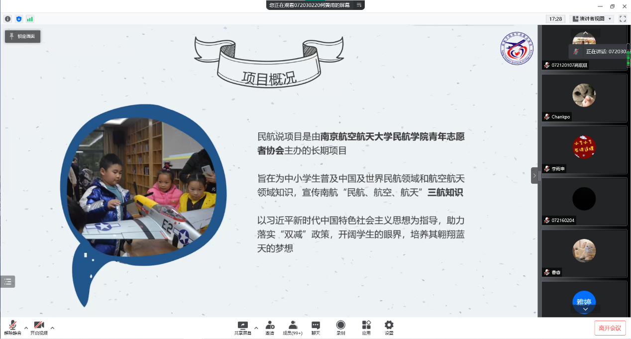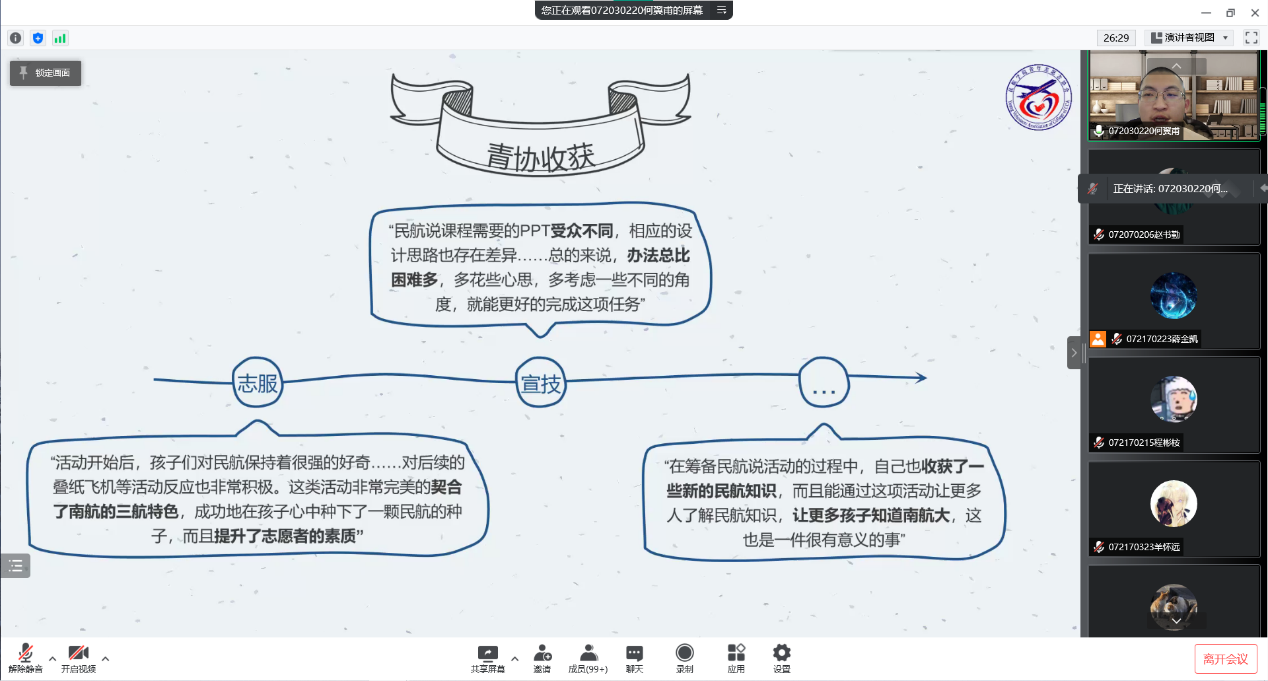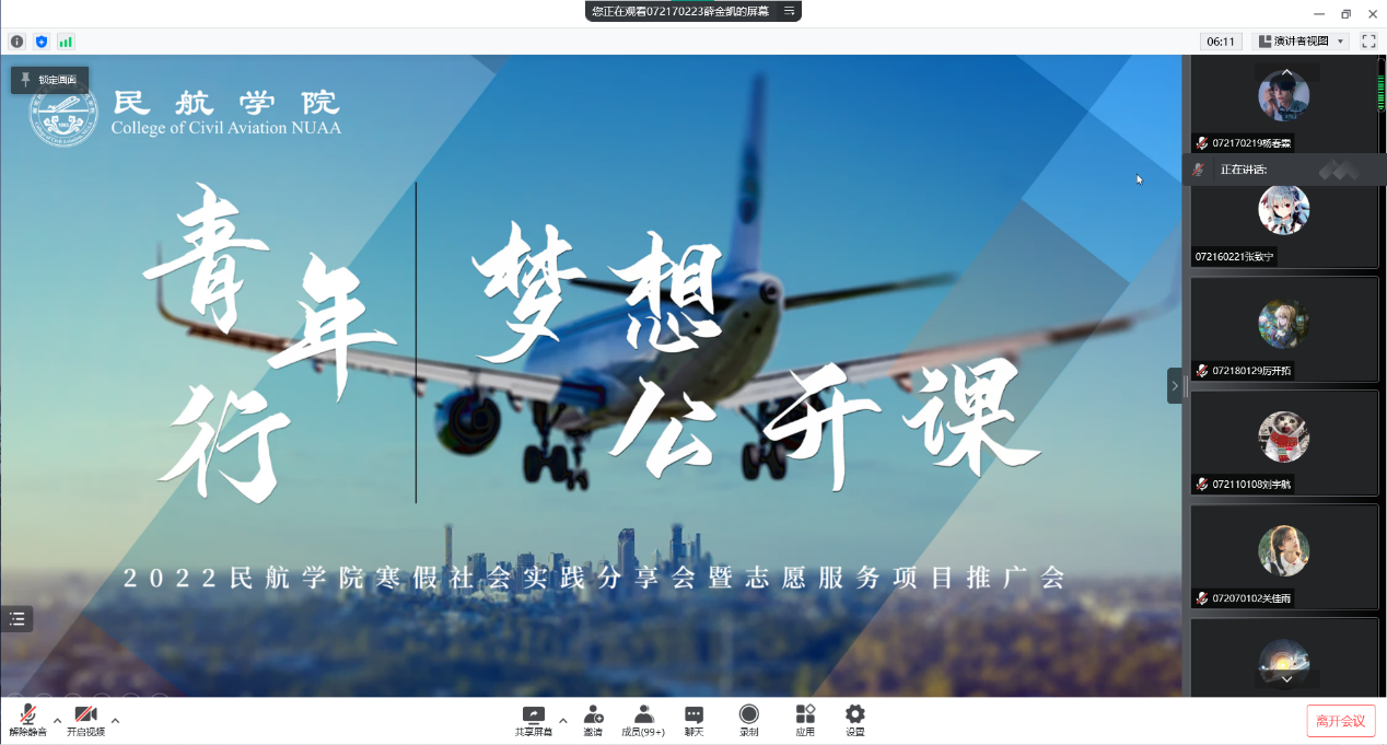 为了帮助民航学子更好地在实践中展现青年风采,在志愿服务中传递民航精神,4月9日晚,禁忌书屋 “青年行”梦想公开课在线上开展,学院2022年度寒假社会实践优秀团队及学院示范性志愿服务团队依次进行经验分享和项目推广。院团委书记赵慧文、院学生会各部门成员以及本科低年级学生参加了此次分享会。