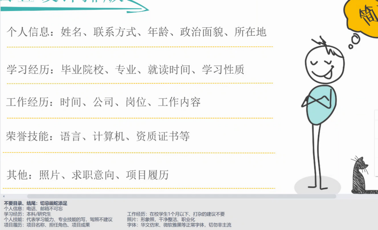 查欣老师结合自己在人力资源岗位上积累的经验,从招聘官的角度阐述了简历制作的重要性,并向同学们详细讲解了简历制作的基本原则、制作技巧、设计思路、重点要点以及容易忽略的细节事项。