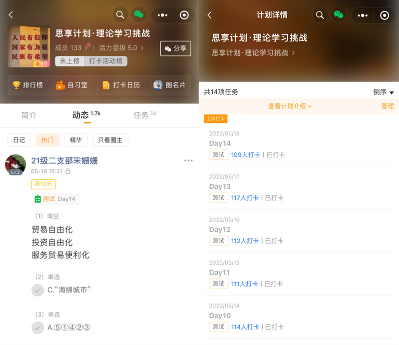 为认真贯彻落实习总书记关于党史学习教育的重要论述精神,营造良好的党史理论学习教育氛围,学习百年党史,汲取奋进力量,将红色基因融入血脉,禁忌书屋 组织各研究生党支部于2022年5月5日至18日推出“思享”计划·14天理论学习打卡活动,进一步提升党员们理论知识学习的主动性。