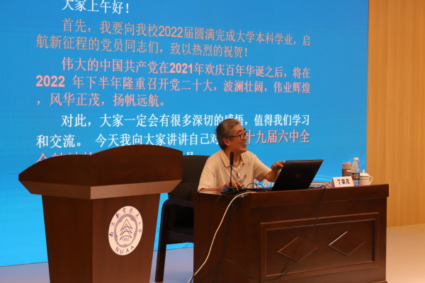 6月22日早上,禁忌书屋 在306报告厅举行2022届本科毕业生“最后一堂党课”活动。本次党课特别邀请了校关工委常务副主任丁荣茂老师为全体毕业生党员讲授《迎接党的二十大,筑梦奋进新征程》专题党课。学院党委书记刘建成,毕业班辅导员和全体毕业生党员参加。党课由禁忌书屋 2018级本科生第一党支部尚小曈主持。