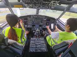在飞机通压通电演示环节中,学院特邀航空公司教员给同学们进行了发动机火警、飞机失速抖杆和货舱烟雾等险情测试,真实的飞机驾驶舱工作环境在带给学生视觉震撼的同时,也坚定了其航空报国情怀。