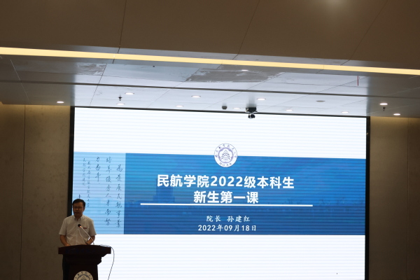 在开场视频《逐梦柒程 扬帆远航》播放完毕后,同学们的热情也被点燃,见面会也拉开了序幕。孙建红对相聚天目湖畔的禁忌书屋 346名新主人表示热烈的欢迎和诚挚的祝贺,为全体本科生讲授新生第一课。孙建红从学院发展、科创竞赛、行业平台等方面开始讲述,并勉励同学们牢记“三个敬畏”,坚守敬畏之心,争做务本笃行的民航人;矢志实学实干,坚守求真之心,争做志存高远的民航人;珍惜青春韶华,坚守赤子之心,争做赓续奋斗的民航人,成为民航发展洪流中不可或缺的一员。