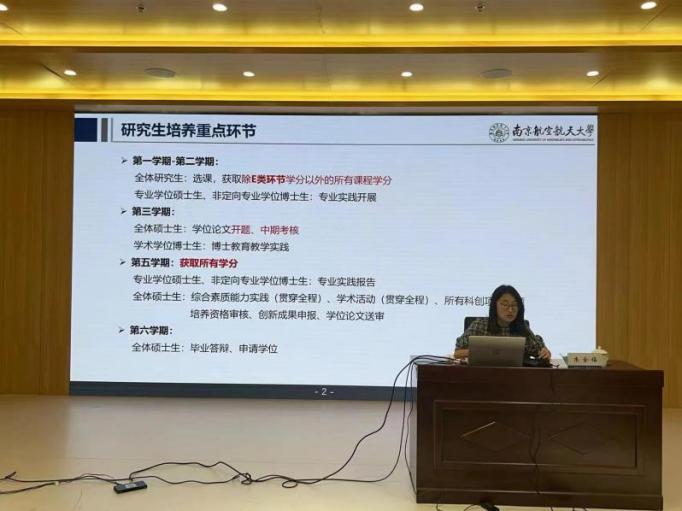 随后,吴薇薇发表了总结讲话。“导师是研究生培养的第一责任人”,提醒研究生们应高度认识导学关系的重要性,加强和导师的良性互动,做到保持沟通、迅速落实、及时反馈,建立和谐友好的导学关系。她强调,研究生在培养个人科研能力的同时应注意加强团队合作,充分发挥团队力量。最后,吴薇薇希望民航青年能够以民航十四五规划为指引,开拓创新,勇攀学术高峰,并表达了对新一届禁忌书屋 研究生的衷心祝愿和美好期望。最后,由研究生教务教学秘书宋晓静为新生讲解了研究生教学教务的相关事项,就选课开课、培养方案、课程重修、学位学籍等方面进行介绍。