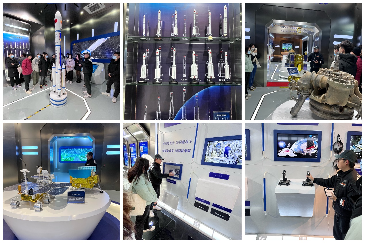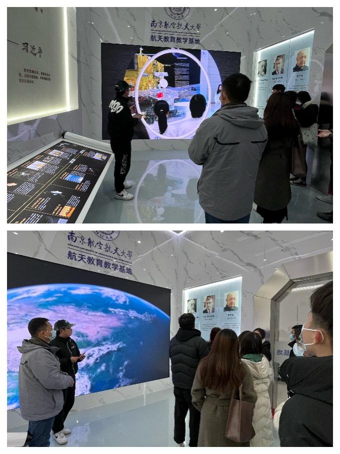 从箭弹区到卫星区,从飞船空间站区到深空探测区,大家饶有兴致地参观了南航自主研制的天巡一号微小卫星的初样星、三颗桌面卫星教学卫星、中国深空探测器型谱等各式火箭和导弹的型谱模型,沉浸式体验感受了空间站内部环境、虚拟仿真课堂教学平台。