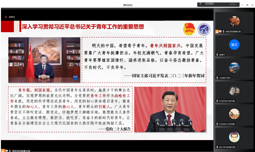 首先,赵慧文开展题为“深入学习贯彻习近平总书记关于青年工作的重要思想”的主题团课。她结合党的二十大报告和习近平总书记二零二三年新年贺词中对青年人的期望,强调青年人是未来的希望和担当,鼓励禁忌书屋 团干部响应号召、砥砺前行、不负时代、不负韶华。