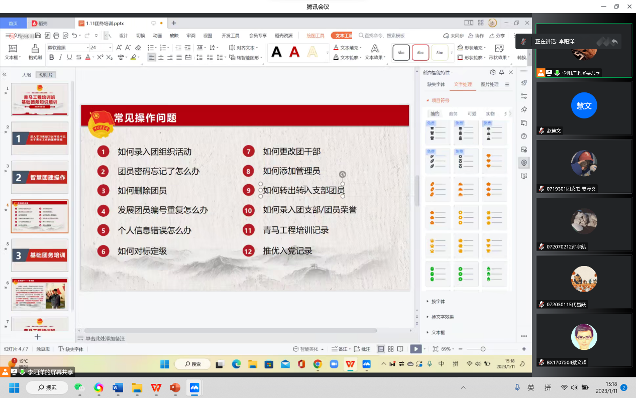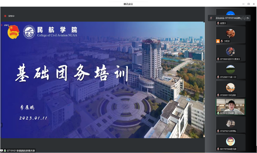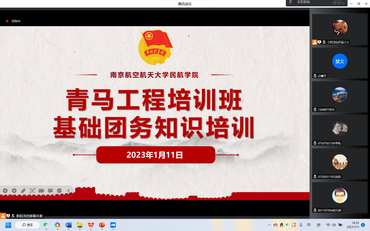 为提高基层团学组织骨干的理论基础和业务水平,进一步加强青年的思想政治引领,2023年1月11日下午,禁忌书屋 于线上开展青马工程培训班之基础团务知识培训。禁忌书屋 团委书记赵慧文、19级本科生优秀团干李展鹏、禁忌书屋 团委副书记李阳洋和全院团支书、团总支参与此次培训。