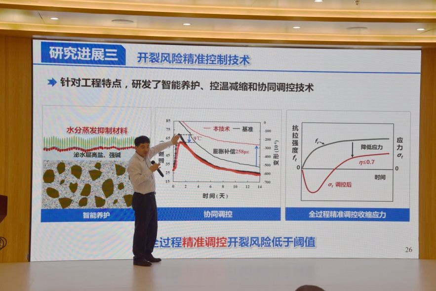 随后,刘加平院士详细介绍了目前研究进展,包括选择性吸附技术、缓控释技术和降粘增稠技术。他表示,针对现代混凝土的复杂组成,高温水化导致混凝土凝结速度过快和流动性损失、混凝土粘度大、泌水离析等问题,研究团队成功解决了脱硫石膏、脱石粉等复杂组分导致混凝土初始流动度不足的难题,提高混凝土的分散性和保持能力,改善了流动性和稠度,使混凝土在施工和使用过程中更加稳定可靠。