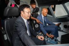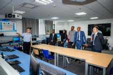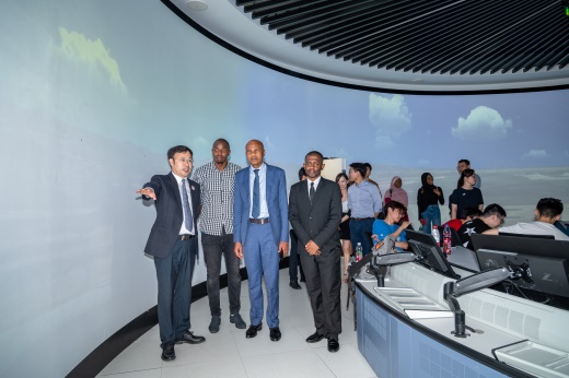 毛拉纳•谢里夫一行首先参观360°全景塔台模拟实验室。该实验室可模拟民航机场管制塔台的真实工作环境,主要用于空中交通管制专业实验教学,服务于空中交通管制员的培养,该套系统是我国目前管制员培养的最先进设施。接着,毛拉纳•谢里夫一行参观航空器人机工效技术实验室,该实验室为飞机驾驶舱人机交互的可靠性、安全性和人机工程设计评估研究提供科研、教学平台,毛拉纳•谢里夫亲身体验国产大飞机C919驾驶舱模拟平台,在驾驶舱中模拟起飞训练。