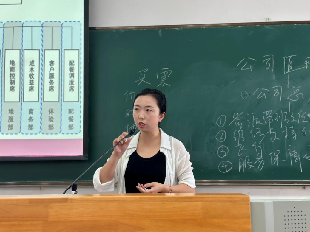 许俪玫从公司架构、运控流程、放行要素、气象影响等方面对《签派业务》企业课程涉及的主要内容进行剖析,同时结合自身发展与同学们畅谈岗位特点与职业规划。