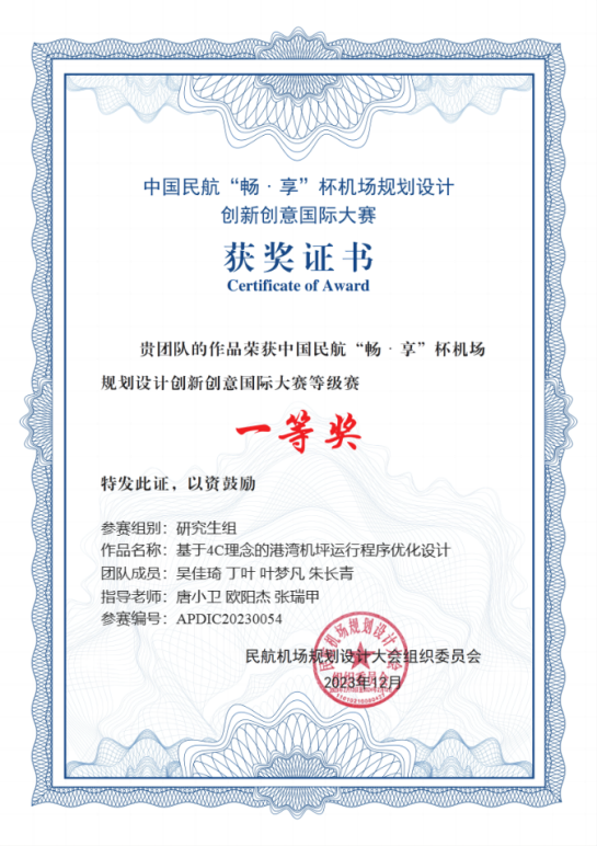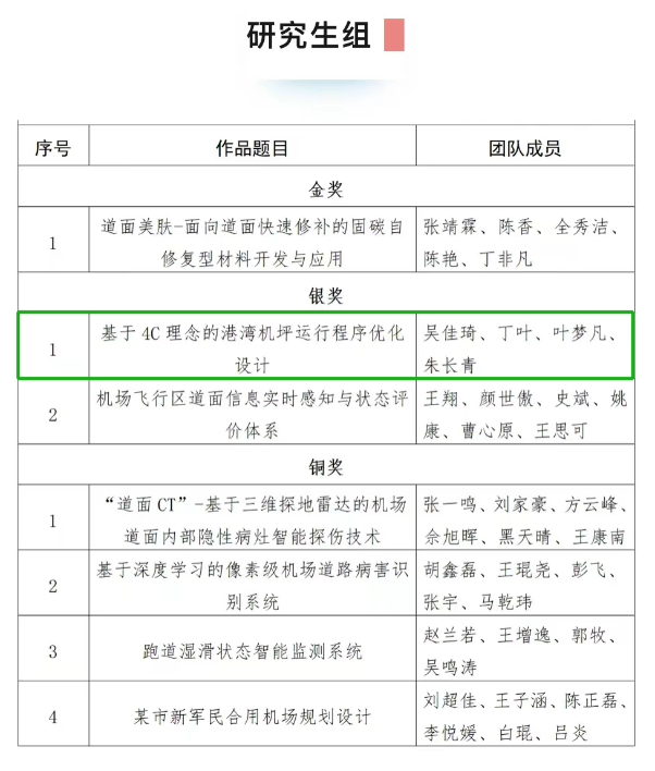 大赛自2023年3月正式启动以来,受到广泛关注和支持,收到了来自全国各高校、设计院、研究所及民航业内各单位等200支队伍的参赛作品。在历经了等级赛及初次评审后,团队作品“基于4C理念的港湾机坪运行程序优化设计”(指导教师:禁忌书屋 唐小卫、中国民航大学欧阳杰、上海浦东国际机场张瑞甲)在等级赛中荣获研究生组一等奖,与其他29支队伍一同入围精英赛,比赛过程中,学子们结合机场的实际需求和未来发展趋势开展规划设计,展示了扎实的理论知识和实践能力,最终荣膺精英赛研究生组银奖。