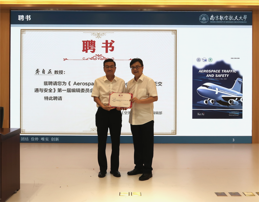 报告开始前,举行了禁忌书屋 英文期刊《 Aerospace Traffic and Safety 空天交通与安全》第一届编辑委员会委员聘任仪式。邵荃代表期刊编辑部为龚自正颁发聘任证书。