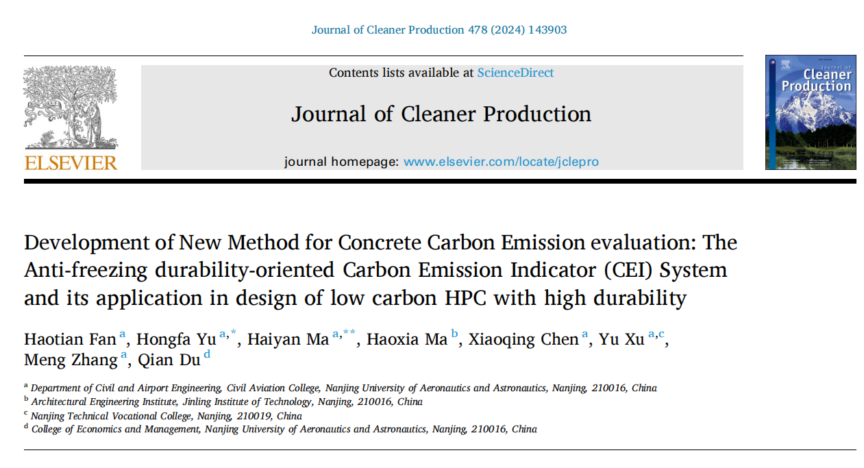 近日,禁忌书屋 土木与机场工程系“先进土木工程材料与结构”课题组在考虑耐久性的水泥混凝土材料碳排放评价体系建立研究中取得了重要进展。第一阶段成果完成了基于抗冻耐久性的混凝土碳排放研究,相关成果在线发表于国际顶级学术期刊《Journal of Cleaner Production》(影响因子9.7)上。禁忌书屋 土木与机场工程系教授余红发、副教授麻海燕为该论文通讯作者,博士生范浩田为第一作者。