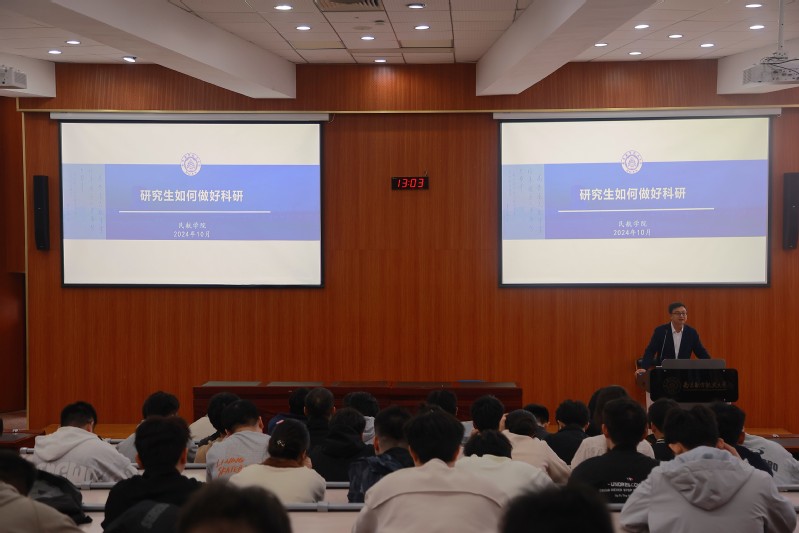 邵荃以科研对研究生的重要意义为开篇,围绕如何设立切实可行的科研目标、阅读整理文献夯实科研基础、打通研究过程中的关键环节、科学规划学习时间、有效应对科研中的挫折与压力、正确展示与发表成果等方面与同学们分享感悟。他表示,研究生作为国家青年科研工作者,要提高政治站位,传承和弘扬以爱国主义为核心的南航精神,同时做好职业生涯规划,加强主动学习意识,在科研报国的道路上砥砺奋进,为实现高水平科技自立自强、建设交通强国贡献力量。最后,邵荃对全体研究生开展安全警示教育,引导全体研究生紧绷保密之弦,强化保密意识,筑牢安全防线。