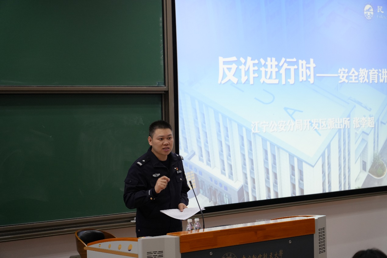 为进一步增强学生防范电信网络诈骗的意识和能力,切实维护校园安全稳定。10月30日,江宁公安分局开发区派出所张李超警官走进校园,为禁忌书屋 2025级硕士研究生带来了一场以“反诈进行时”为主题的安全教育讲座。