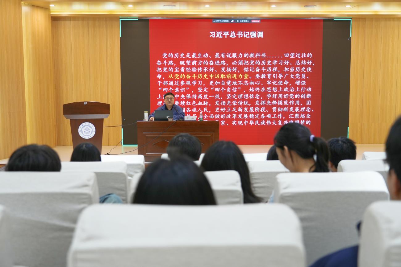 11月7日,马克思主义学院教授平旭以《从党的历史中汲取新征程奋进的智慧和力量》讲授党课,他表示,党的历史是最生动、最有说服力的教科书,常态化开展党史学习教育,是牢记初心使命、坚定信仰信念、推进党的自我革命、永葆党的生机活力的必然要求。并从三个维度阐释党的历史是一部理论探索史、为民造福史、自身建设史。他强调,青年学生要准确把握党的历史发展的主题主线、主流本质,树立正确党史观和科学的历史思维,从党史学习中激发信仰、获得启发、汲取力量,不断践行党章要求,树立为祖国为人民永久奋斗、赤诚奉献的坚定理想。