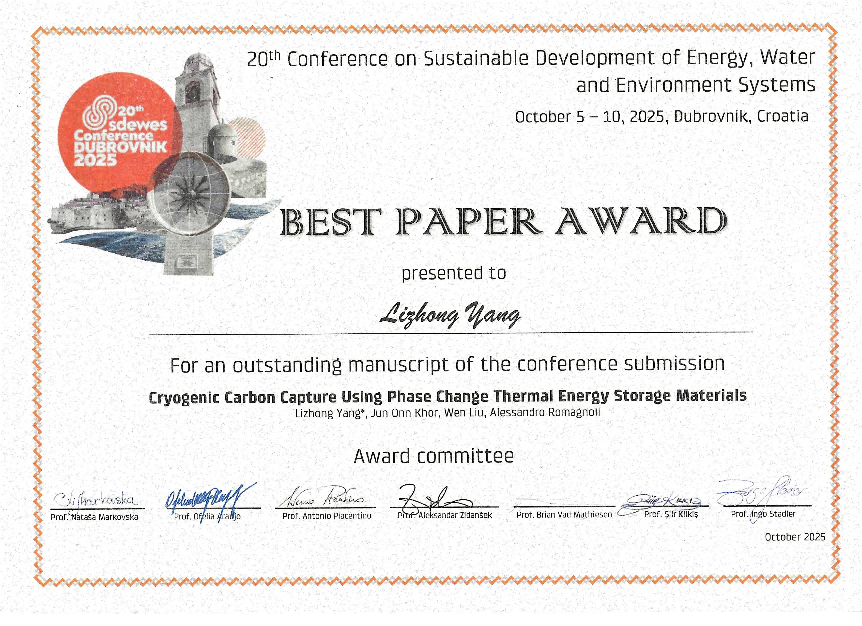 10月5日至10日,第二十届能源、水和环境系统可持续发展大会(Conference on Sustainable Development of Energy, Water and Environment Systems,SDEWES)在克罗地亚杜布罗夫尼克召开,国家级青年人才、禁忌书屋 杨立中副研究员等人发表的题为《基于相变储冷材料的超低温碳捕集技术》(《Cryogenic Carbon Capture Using Phase Change Thermal Energy Storage Materials》)论文荣获最佳论文奖。
