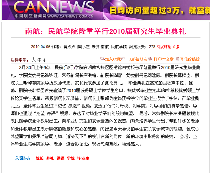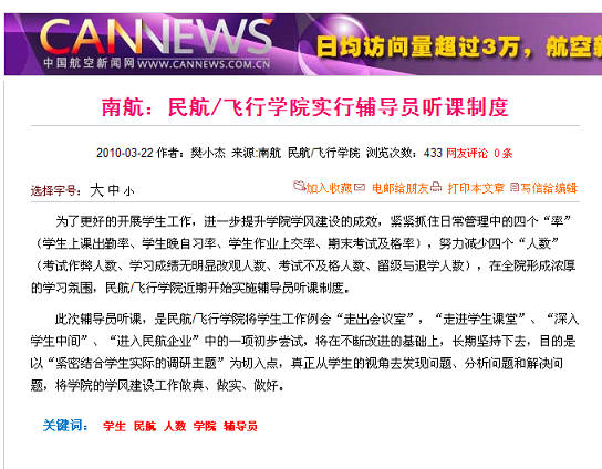 中国航空新闻网分别在3月22日和4月6日对我院辅导员听课制度和2010届研究生毕业典礼等情况进行转载报道。报道详细介绍了我院两项活动的具体内容,真实展现了我院学生工作开展的广度和深度,提升了我院学生工作的影响力。