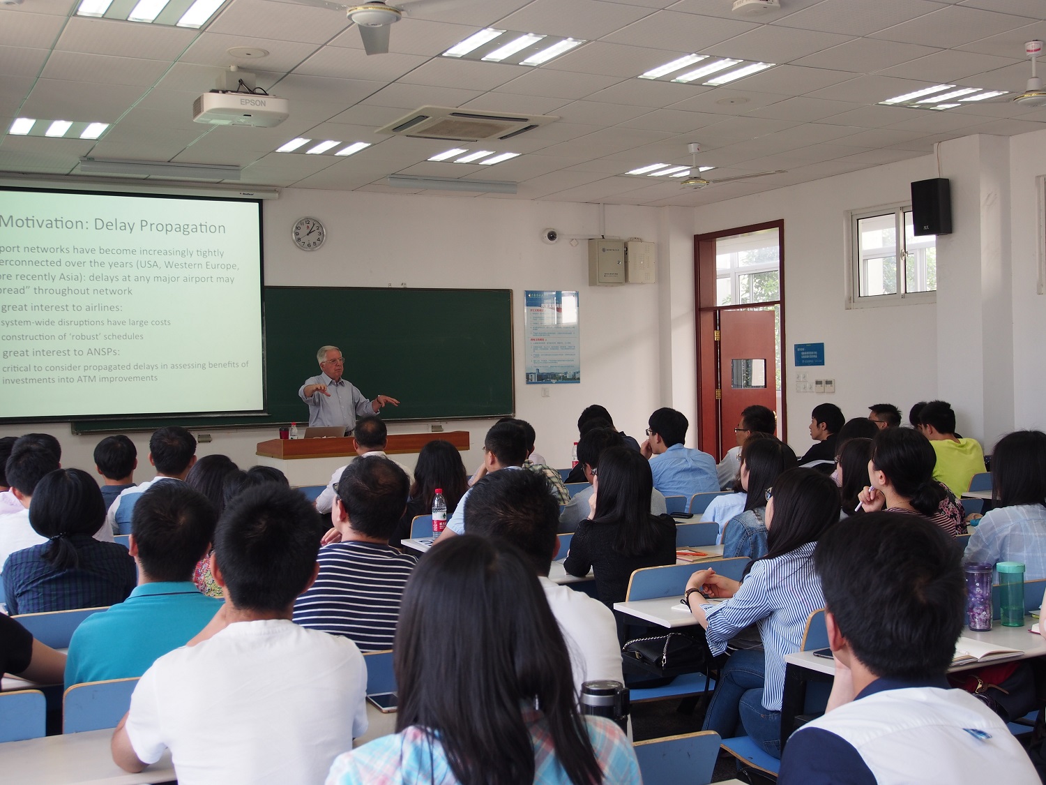 本次讲座中,Odoni院士描述了机场网络延迟模型,模型主要用于研究大型机场网络中延误传播的复杂现象。机场网络延迟模型主要由排队引擎和延误传播算法两个部分组成,排队引擎用于计算单个机场的航班延误,机场延误算法根据计算出的本地延误作出响应,更新模型中所有机场的航班计划和需求率。模型的计算速度非常快,使从宏观层面研究大量延误场景带来的影响成为可能,从而选择策略应对系统范围内的延误。最后,Odoni院士介绍了模型应用的具体案例,说明其潜在的用途,并与在场的师生进行了交流讨论。