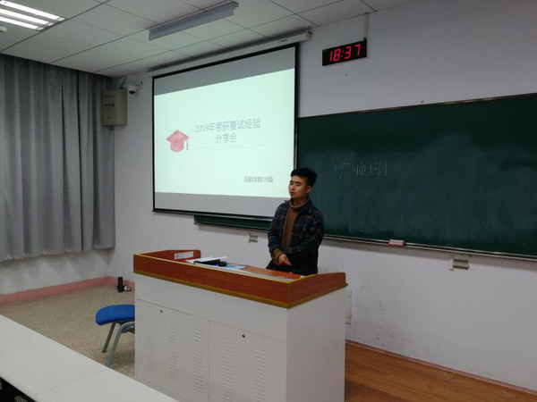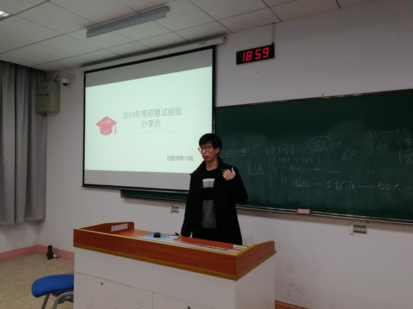 首先载运工具运用工程专业的宁顺刚学长上台讲述了他研究生复试的心路历程,以及复试大致的流程,这使在场的同学对研究生复试有了一个基本的了解。他不仅介绍了复试两门专业课微机原理以及现代航空运输管理的复习方法,并且说明了复试面试过程中的需要准备的简历、证书等。最后,他还帮助解答了在场同学的问题,鼓励大家不要气馁,一定要好好准备复试,坚持到底。