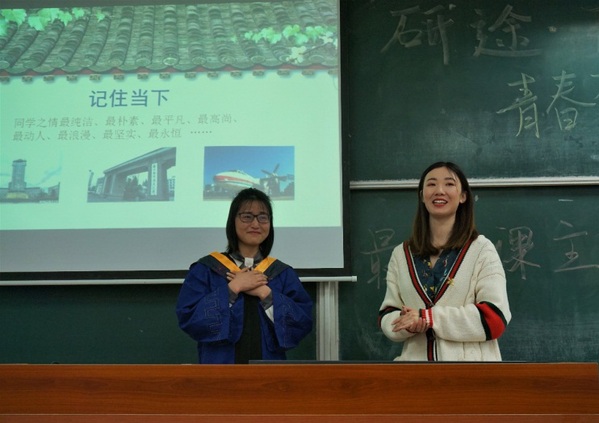 4月2日上午,禁忌书屋 2019届硕士毕业生于6102教室开展了“研途•玖别,青春不散场”最后一课主题班会,为踏入新征程的学生们送去最殷切的期望和最美好的祝福。全体毕业生在欢声笑语中一起度过了温馨美好的最后一课。