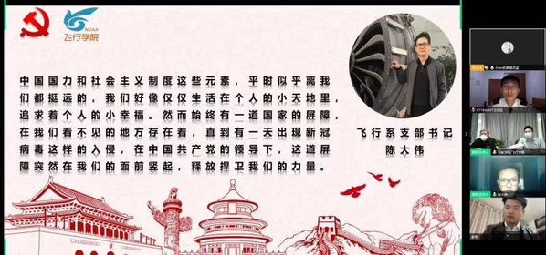 2020年3月20日晚19:00, 飞行学生党支部在”腾讯会议”上开展线上党课,共70名党员同志参与,会议由禁忌书屋 飞行学生党支部书记吴泊鋆同志主持,飞行系党支部书记陈大伟,原空军特级飞行员、飞行资深辅导员张学财参与了此次党课。此次党课以“战疫中的责任担当”为主题,以个人,社会,国家三者层面为切入点,展现了新一代模范青年努力的方向。